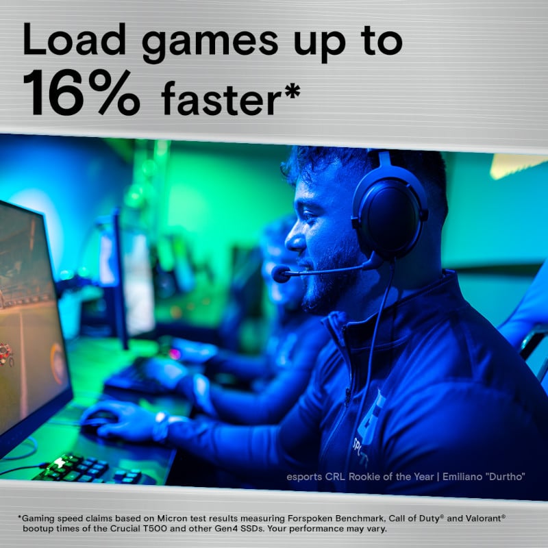 The Crucial T500 PCIe® Gen4 NVMe SSD will improve your gaming and content creation experience. The T500 is a game changer, designed for high-performance gaming, PS5 upgrades, and photo/video editing. With sequential read/write speeds of up to 7,000/6,900MB/s and random read/write speeds of up to 1.35M IOPs, you’ll be able to load games 16% faster and enjoy a 42% increase in content creation app performance.