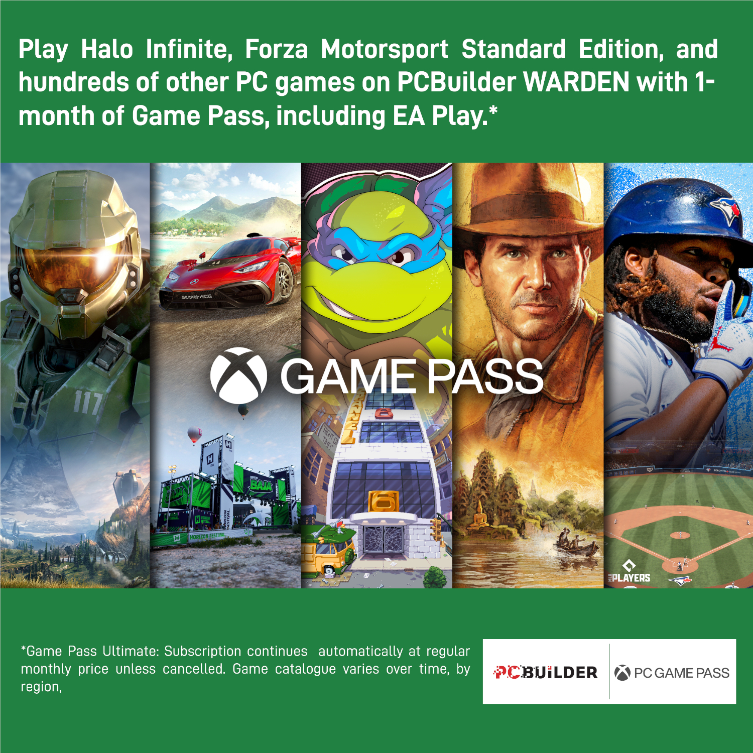 - Play over 100 high-quality PC games like Halo Infinite, Forza Horizon 5 and Teenage Mutant Ninja Turtles: Shredder’s Revenge with your new build and one month of PC Game Pass including EA Play. With new games being added all the time, there’s always something new to play from day one.